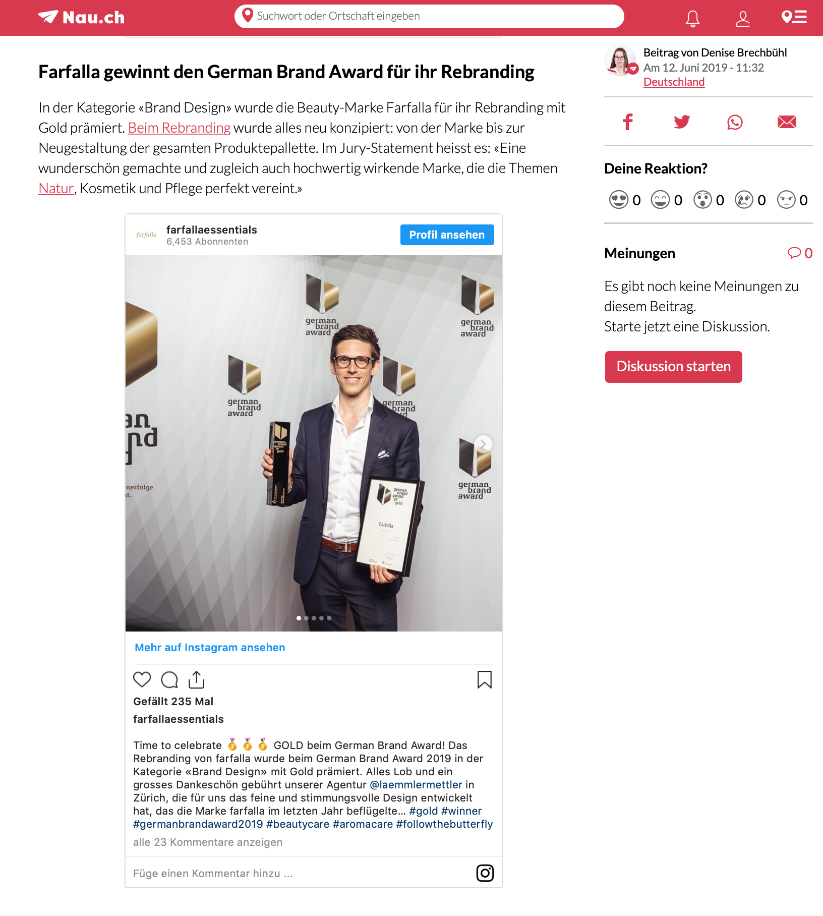 Im Jury-Statement heisst es: «Eine wunderschön gemachte und zugleich auch hochwertig wirkende Marke, die die Themen Natur, Kosmetik und Pflege perfekt vereint.» https://www.nau.ch/news/europa/german-brand-award-2019-geht-auch-an-schweizer-marken-65537459