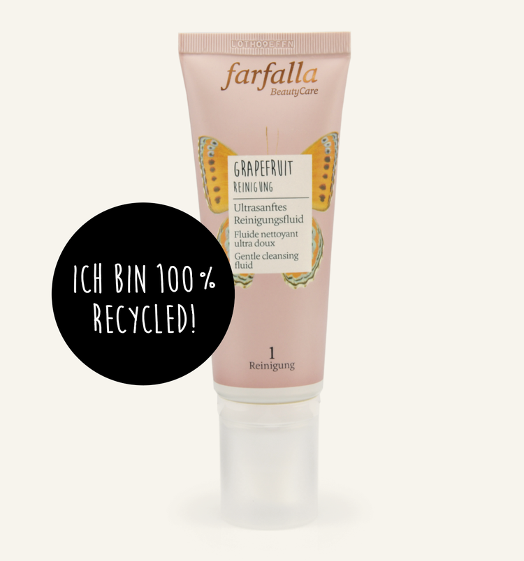 Das Grapefruit Sanftes Reinigungsfluid ist das erste farfalla-Produkt, dessen Tube aus100 % Recyclingplastik (aus gebrauchten Milchflaschen) besteht. Andere Produktverpackungen unserer Naturkosmetik werden in Rececylingqualität folgen.